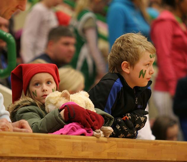 Ljósmynd/ [email protected] – Þessi unga dama á myndinni ákvað að taka með sér bangsann sinn á leikinn en hún á vísast von á löngu kvöldi í Ljónagryfjunni.