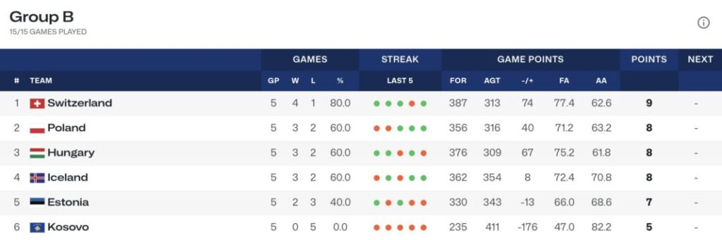 Sú niðurstaða var hinsvegar ekki nóg fyrir Ísland til þess að komast í átta liða úrslit mótsins, þar sem aðeins tvö efstu liðin úr riðlunum fjórum komust áfram í þann hluta keppninnar. Eins og sjá má hér fyrir neðan var Ísland þó ekki langt frá því, en aðeins er það stigatala þeirra gagnvart Póllandi og Ungverjalandi sem heldur þeim í 4. sætinu, þar sem liðið vann jafn marga leiki.
