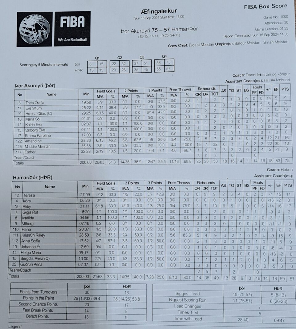Þór og Hamar/Þór mættust í æfingaleik á Akureyri í dag og höfðu heimakonur betur, en bæði lið undirbúa sig þessa dagana fyrir komandi tímabil í Bónus deild kvenna. Mikið jafnræði var á með liðinum lengi framan af leik, en fyrir lokaleikhlutann munaði aðeins 5 stigum á þeim heimakonum í vil. Í þeim fjórða náðu þær svo góðum tökum á leiknum og var sigur þeirra öruggur að lokum, 75-57.