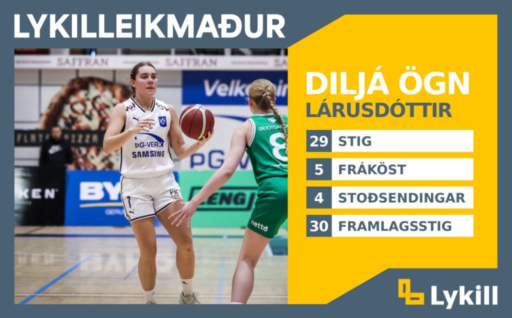 Í þriðja sigurleik Stjörnunnar í röð sem kom heima í ÞG verk höllinni gegn Ármanni var Diljá besti leikmaður vallarins. Á tæpum 28 mínútum spiluðum skilaði hún 29 stigum, 5 fráköstum, 4 stoðsendingum og stolnum bolta. Þá var hún nokkuð skilvirk í leiknum, með 3 af 5 fyrir utan þriggja stiga línuna, aðeins einn tapaðan bolta og 30 framlagsstig fyrir frammistöðuna.