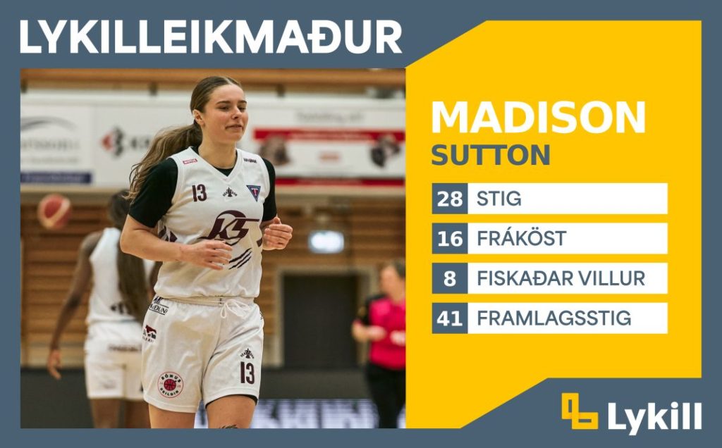 Madison Sutton átti hreint út sagt stórkostlegan leik fyrir Tindastól gegn Ármanni þar sem hún var framlagshæst allra með 41 framlagspunkt. Hún skoraði 28 stig og nýtti skotin sín vel, þar af setti hún niður 10 af 18 tveggja stiga skotum sínum og var með fullkomna 100% nýtingu á vítalínunni þar sem öll 8 vítaskotin fóru niður. Madison drottnaði í teignum og tók samtals 16 fráköst (6 sóknarfráköst og 10 varnarfráköst), auk þess sem hún gaf 5 stoðsendingar, stal 4 boltum og fiskaði 8 villur á mótherjana á þeim rúmu 31 mínútu sem hún spilaði, en hún endaði leikinn með glæsilega +26 í plús/mínus tölfræði.