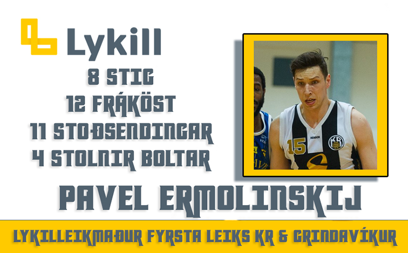 Lykilleikmaður fyrsta leiks úrslitaeinvígis KR og Grindvíkur var leikmaður KR, Pavel Ermolinskij. Fór fyrir sínum mönnum eins og herforingi. Á 30 mínútum spiluðum í leiknum var Pavel aðeins tveimur stigum frá þrefaldri tvennu, skoraði 8 stig, tók 12 fráköst, gaf 11 stoðsendingar og stal 4 boltum. KR liðið í heildina þó mjög gott í þessum leik, þar sem sex leikmenn þeirra voru með 15 eða meira í framlag.