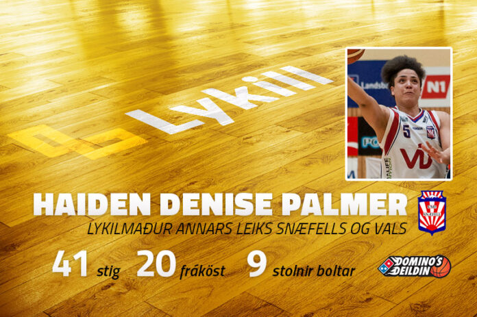 Karfan.is hefur valið Haiden Palmer, leikmann Snæfells, Lykilmann annars leiks Snæfells og Vals í undanúrslitum Domino's deildar kvenna. Palmer lék á alls oddi í öllum leiknum en var alls ráðandi í framlengingunni þar sem Snæfell sigldi bátnum heim. Palmer skoraði 41 stig, tók 20 fráköst, gaf 6 stoðsendingar og stal 9 boltum í leiknum. Tölfræði sem gaf henni hvorki meira né minna en 57 framlagspunkta en það er hæsta framlagsgildi vetrarins og bætir met Whitney Frazier um 2 stig.