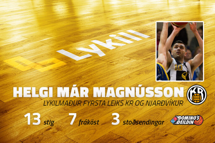 Karfan.is hefur útnefnt Helga Má Magnússon Lykilmann fyrsta leiks KR og Njarðvíkur í undanúrslitum Domino's deildar karla. Helgi lék einna best í frekar slöku KR liði en var afar drjúgur í varnarleik sínum á Hauk Helga Pálssyni í lok seinni framlengingarinnar. Fram að því hafði Haukur haldið Njarðvík inni í leiknum. Helga tókst að slá boltann úr höndum Hauks á lokasekúndum seinni framlengingarinnar en það fór langt með að tryggja KR sigurinn.