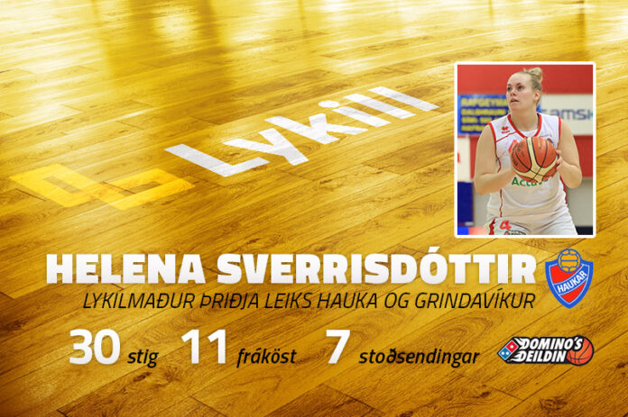Karfan.is hefur útnefnt Helenu Sverrisdóttur sem Lykilmann þriðja leiks Hauka og Grindavíkur í undanúrslitum Domino's deildar kvenna. Helena var 3 stoðsendingum frá þrennunni, með 30 stig, 11 fráköst og 7 stoðsendingar. Yfirburðamanneskja á vellinum í gærkvöldi, bæði í sókn og vörn og Grindavíkingar áttu engin svör við hennar leik.