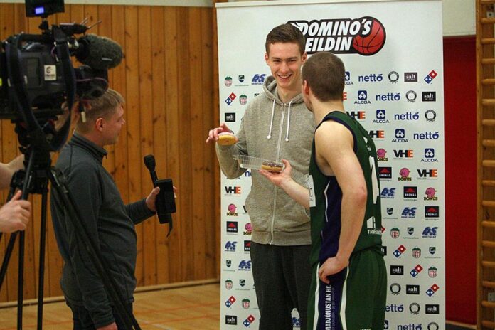 „Maðurinn er heltekinn af kleinuhringjum, hann skrifaði matardagbók fyrir mig í sumar og þá var hann að jarða „donuts“ í morgunmat! Maður hefur verið að reyna að taka aðeins til í þessu mataræði hjá drengjunum en eftir sigurleiki þá gefur maður smá slaka,“ sagði Baldur en sá hefur verið sigurviss fyrir leikinn gegn Hetti því það er nokkuð ljóst að „Fjallið“ eins og hann er stundum kallaður hefur farið á stúfana til Reykjavíkur, verslað á Dunkin´Donuts, pakkað þeim niður og haft þá klára fyrir Ragnar að leik loknum og verðlaunað sinn mann fyrir vel unnin störf. Ragnar var stigahæstur í liði Þórs í gær með 20 stig og 2 fráköst og að því er virðist á myndinni 2 kleinuhringi líka.