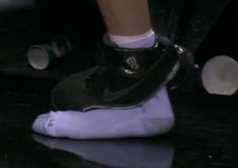 Það styttist í sprengidaginn og í tilefni af því ákvað Manu Ginobili að sprengja skóinn sinn á meðan hann spilaði vörn gegn Detroit Pistons í nótt. Við skulum vona að þetta sé ekki eitthvað sem á eftir að gerast oftar, að Manu sé bara svona kraftmikill eða að þetta sé bara mánudagseintak af Nike Air Max Closer IV skónum hans. Kannski voru þeir bara orðnir slitnir eftir öll Euro-steppin.