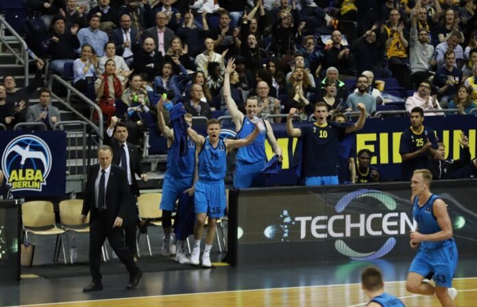 Eitt lið var á vellinum í fyrri hálfleik en staðan eftir hann var 59-41 fyrir Alba Berlín. Berlínarmenn voru með 7 af 9 þriggja stiga skotum sínum ofan í og ekkert virtist geta stöðvað þá.