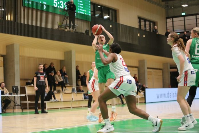 Allt annar og betri bragur var á Njarðvíkingum í upphafi annars leikhluta og komust grænar yfir 36-34 þar sem Sara Björk Logadóttir var að gera vel. Njarðvík opnaði annan leikhluta 17-8 en næstu fimm mínútur gerðu Haukar 21 stig með Amandine í broddi fylkingar og leiddu 46-55 í hálfleik. Amandine var í banastuði með 27 stig í fyrri hálfleik en hún lokaði honum með stolnum bolta og körfu fyrir gestina sem fóru með myndarlegan meðbyr inn í búningsklefa.