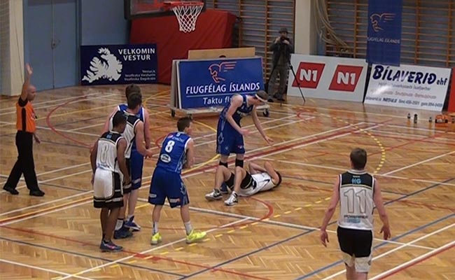 Mynd: Jón Hrafn Baldvinsson, fyrirliði Ísfirðinga, liggur óvígur í gólfinu eftir að hafa fengið óviljandi högg frá Marvini Valdimarssyni í andlitið.