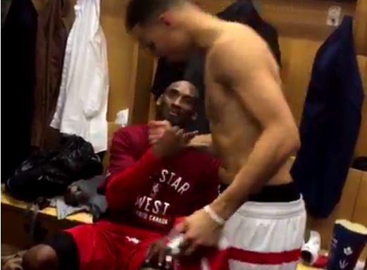 Já sjaldan að maður sjá slíkt á video en besti leikmaður NBA deildarinnar í dag Stephen Curry skellti sér til Kobe Bryant inní klefa fyrir leik og bað þann gamla um eiginhandaráritun.  Curry leit út eins og lítill strákur í nammibúð að bíða eftir troðfullum pokanum á meðan Kobe týndi ofaní.