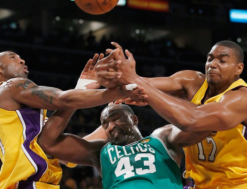 Mynd: Andrew Bynum hér í baráttunni við Kendrick Perkins og samherja sinn Kobe Bryant.