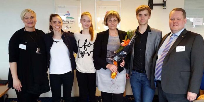 Mynd: Gerður Guðjónsdóttir ásamt börnum sínum og Guðbjörgu Norðfjörð, varaformanni KKÍ, og Hannesi S. Jónssyni formanni KKÍ.