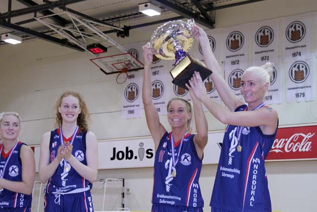 Síðari hálfleikur var einstefna þar sem Keflvíkingar léku góða vörn, KR skoraði aðeins 12 stig í síðari hálfleik og svo fór að Keflavík lyfti deildarmeistaratitlinum í DHL-höllinni eftir öruggan 40-73 sigur á KR.