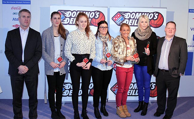 Mynd/ [email protected] – Frá vinstri: Birgir Örn Birgisson framkvæmdastjóri Domino´s á Íslandi, Hildur Björg Kjartansdóttir, Sara Rún Hinriksdóttir, Hildur Sigurðardóttir, Pálína María Gunnlaugsdóttir, Helga Einarsdóttir og Hannes S. Jónsson formaður KKÍ. Á myndina vantar Sigurð Ingimundarson þjálfara Keflavíkur og Lele Hardy spilandi þjálfara Njarðvíkurliðsins.