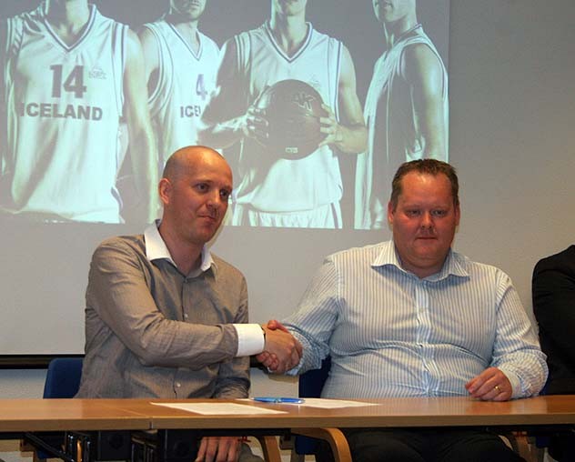 Mynd/ [email protected] – Hannes S. Jónsson formaður KKÍ og Bjarmi frá Peak við undirritun samninga í gær.