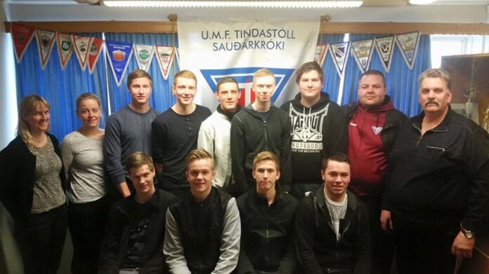 Ásamt leikmönnunum á myndinni eru frá vinstri Una Sigurðardóttir gjaldkeri, Hafdís Einarsdóttir stjórnarmaður, Stefán Jónsson formaður og Björn Hansen stjórnarmaður.