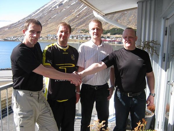Mynd/ Sævar formaður KKD KFÍ ásamt stjórnarmönnunum Guðna Ó. Guðnasyni og Ingólfi Þorleifssyni handsala hér samninginn með Pétri Má. Sigurðssyni.