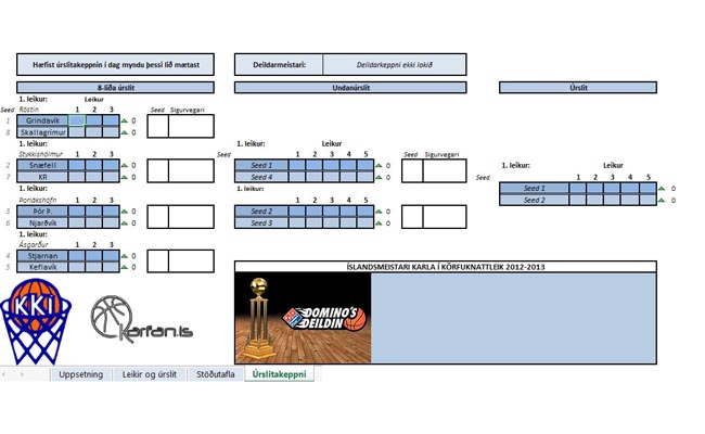 Karfan.is hefur í samstarfi við valinkunna menn unnið að gerð reiknirits fyrir Domino‘s deild karla tímabilið 2012-2013 og kynnir það hér með til leiks. Eina sem þarf að gera er að stimpla inn úrslit leikja í skjalið, hvort sem um er að ræða raunveruleg úrslit leikjanna, getgátur eða hreina tilraunastarfsemi. Skjalið reiknar svo út fyrir þig eftir kúnstarinnar reglum í hvaða sæti liðin í deildinni lenda og sýnir, miðað við innstimpluð úrslit og stöðuna í deildinni hverju sinni, hverjir mótherjar í úrslitakeppninni verða.