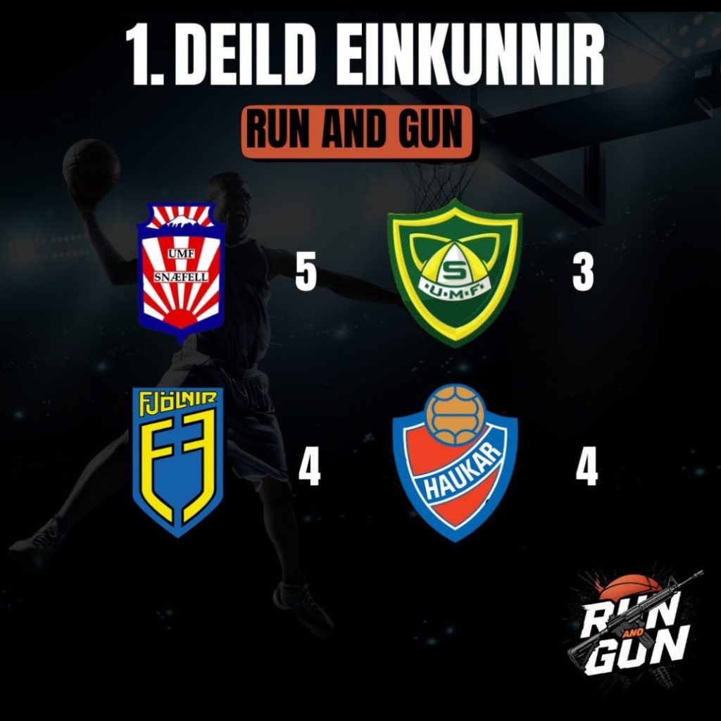 Hlaðvarpið gaf liðunum í 1. deild karla sem eru komin í sumarfrí fremur lágar einkunnir fyrir tímabilið, þar sem Snæfell stendur hæst með 5. Lið Fjölnis og Hauka fylgja fast á eftir með einkunnina 4, en Skallagrímur rekur lestina með einkunnina 3. Þessar tölur gefa til kynna að Run & Gun teymið telji að þessi lið hafi ekki náð að uppfylla væntingar eða hámarksárangur á nýafstöðnu móti og eigi talsvert verk fyrir höndum í uppbyggingu fyrir næsta tímabil.