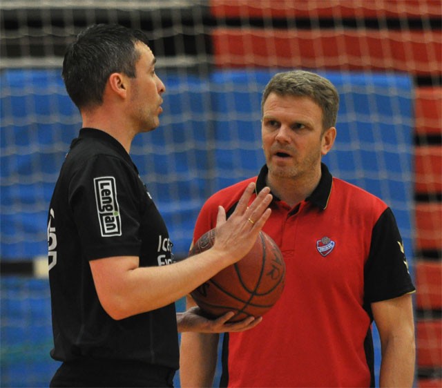 Mynd: Henning í viðræðum við dómara leiksins – Tomasz Kolodziejski