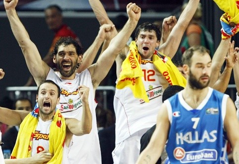 Ljósmynd/www.fiba.com – Spánverjar fögnuðu vel sigrinum á Grikkjum í gær.