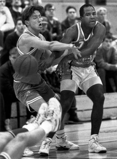 Ljósmynd/ Sigurður Elvar lék með ÍA og Skallagrím áður fyrr og hér er hann í glímu við einn nafntogaðasta leikmann sem komið hefur til landsins, Franc Booker.
