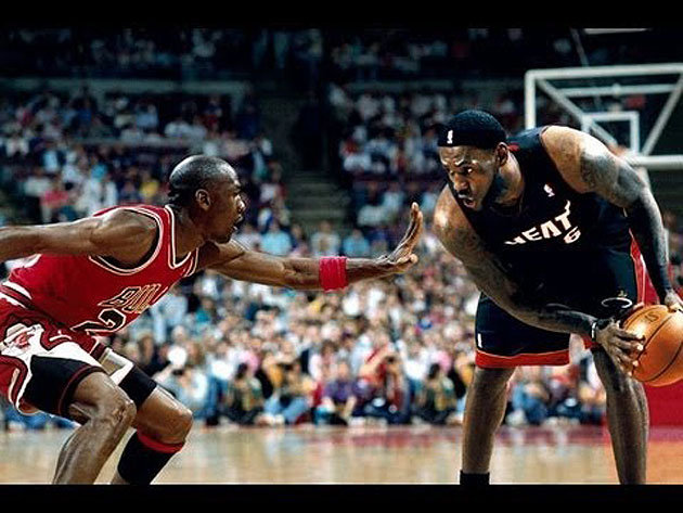 Lebron James leikmaður Miami Heat er með sem “Wallpaper” á snjall síma sínum mynd af sér gegn kónginum sjálfum Michael Jordan. Eflaust er óhætt að segja það þetta er einvígið sem allir dreyma um en mun því miður aldrei verða. Tæknin í dag með “Photoshop” er hreint út sagt ótrúleg og Lebron augljóslega eitthvað verið að fikta með forritið. Við hrærum þar með í könnun hér á síðunni og spyrjum. Hver myndi hafa betur í 1 á 1. Kóngurinn MJ eða LBJ?