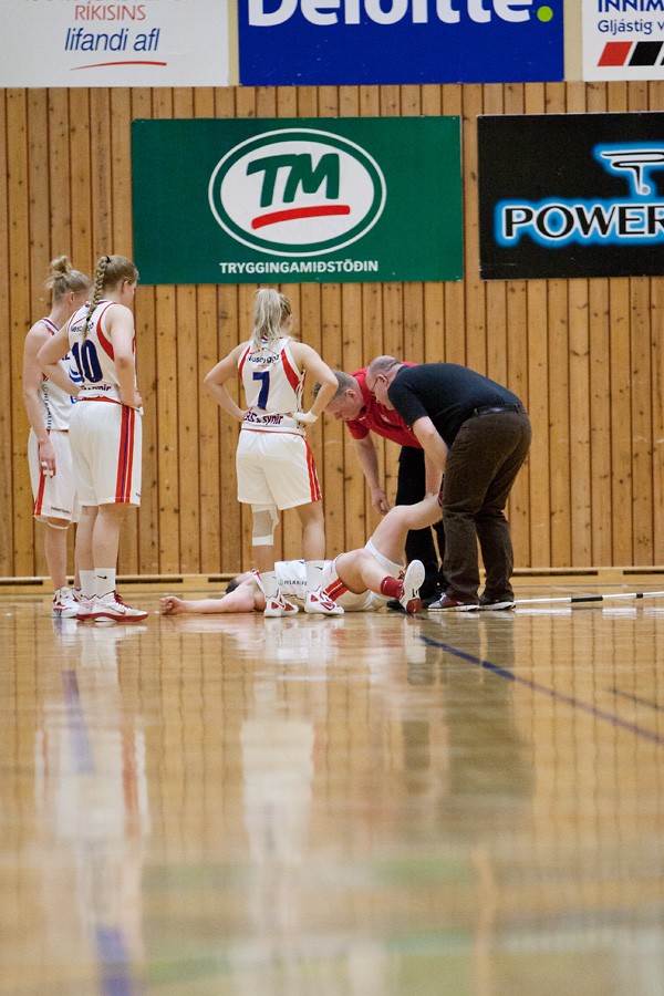 Mynd/ Þorsteinn Eyþórsson – Hildur fær aðhlynningu í leiknum gegn Haukum fyrr í vikunni.
