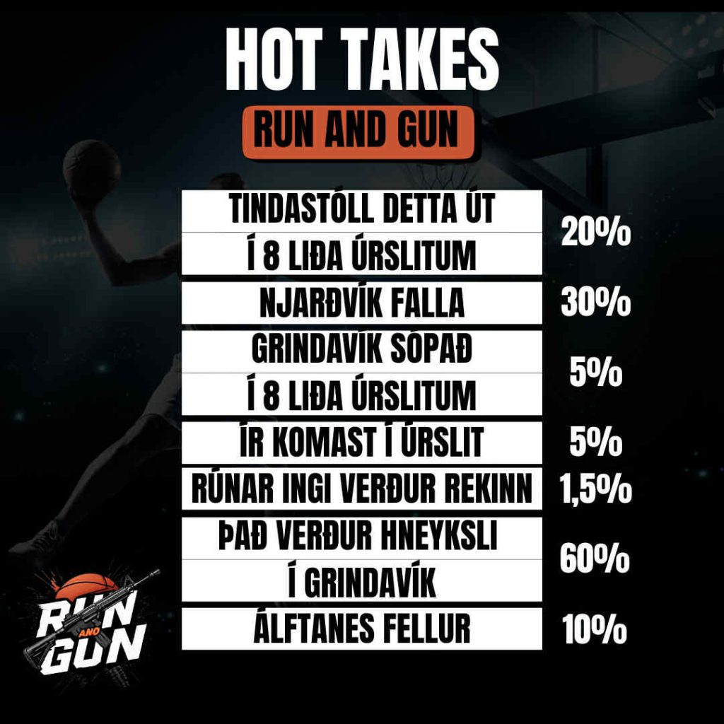 Þá er setur þáttarstjórnandinn Máté Dalmay fram nokkur hot teik í þættinum og fær þann Slæma og Manna Vill til að gefa sína skoðun á þeim. Teikin má sjá hér fyrir neða og er umræðuna að finna í þættinum, en eins og sjá má telja þeir ágætis líkur á að það verði hneyksli í Grindavík, en gefa lítið fyrir að þeim verði sópað í átta liða úrslitum úrslitakeppninnar.
