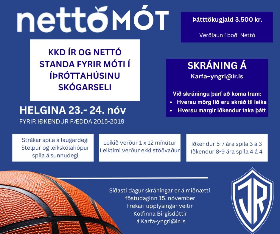 Nettómót ÍR fer fram í íþróttahúsinu Skógarseli helgina 23-24 nóvember. Strákar spila á laugardegi og stelpur og leikskólahópur spila á sunnudegi. Mótið er svokallað hraðmót og fá öll lið a.m.k. 4 leiki og ættu lið að vera búin með sína dagskrá innan 4 klst. Iðkendur 5-7 ára spila 3 á 3 og 8-9 ára spila 4 á 4. Skráning fer fram á [email protected] og við skráningu skal tekið fram fjöldi liða í hverjum flokki og hversu margir iðkendur taka þátt.