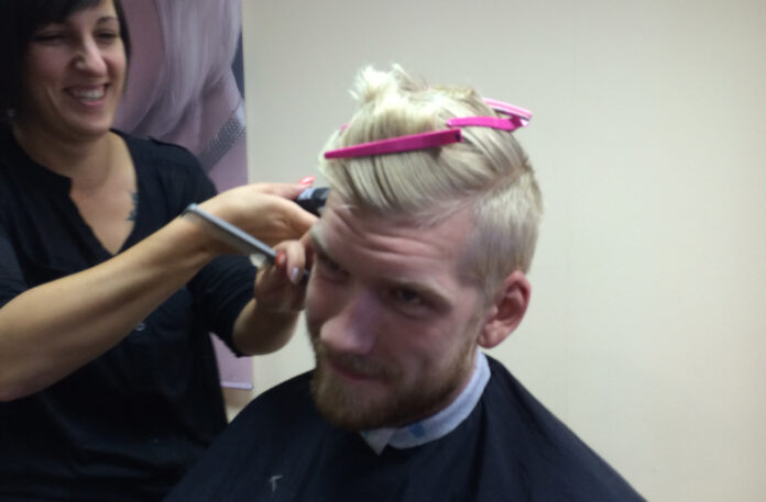 Hinsvegar var þetta öllu flóknara hjá Ragnari. Raka hliðar, þynna í þétt vöxnum toppnum og svo "stríðsrönd" á miðja kúpuna. Voila!