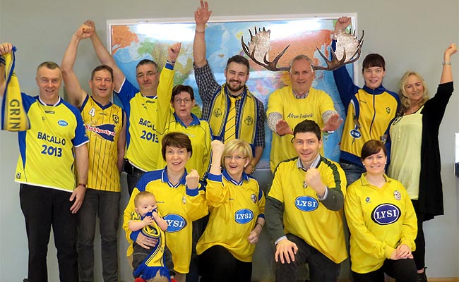 Við fengum meðfylgjandi mynd senda úr Grindavíkinni í dag. Nokkuð ljóst að bikarstemmningin í bænum er að ná hámarki enda eigast við Grindavík og ÍR í Poweradebikarúrslitum karla á morgun kl. 16:00 í Laugardalshöll. Þessir starfsmenn hjá Þorbirni HF mættu gulir og glaðir í vinnuna í dag.