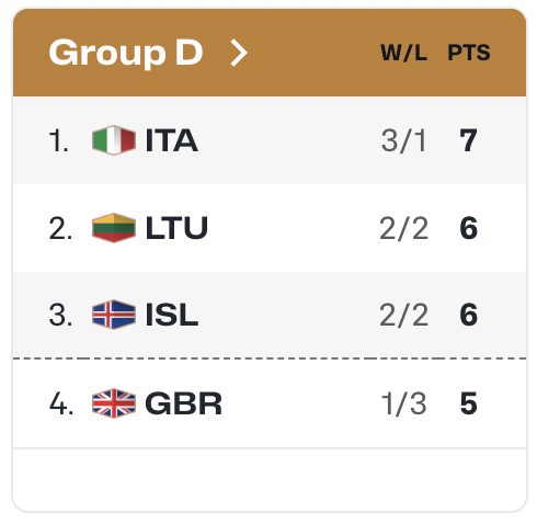 Staðan í riðil Íslands eftir þessa fyrstu tvo glugga er því þannig að Ítalía er í efsta sætinu með þrjá sigra, Litháen er í öðru með innbyrðis á Ísland og tvo sigra og Ísland er í þriðja sætinu einnig með tvo sigra. Bretland er í neðsta sætinu, því eina sem fer ekki áfram í næsta fasa keppninnar, með einn sigur.