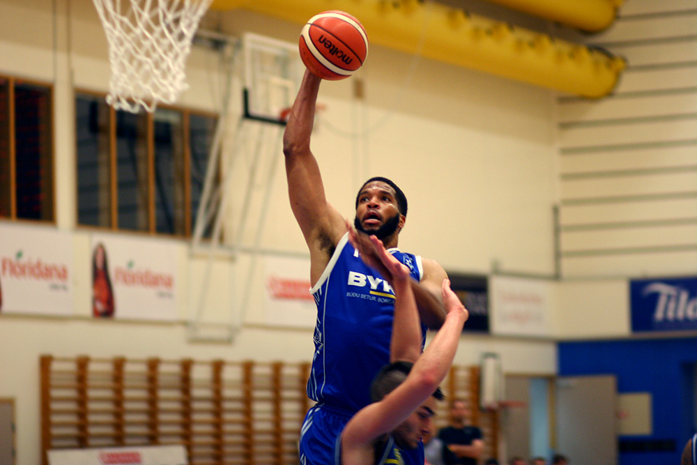 Mynd:  Al'onzo Coleman treður með tilþrifum í leik Stjörnunnar og Fjölnis í Dalhúsum í kvöld. (HT)