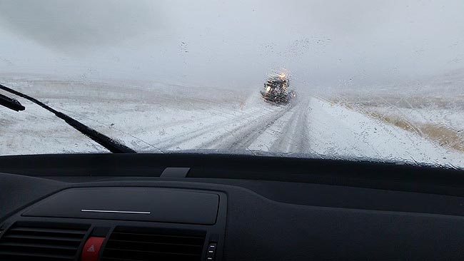 Hún er ekki fögur færðin en þetta þekkja Stólarnir í bak og fyrir en það léttir heldur til fyrir ferðalangana þegar nær dregur suðvesturhorninu þar sem snjórinn hefur enn ekki látið til skarar skríða.