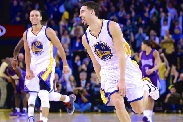 Klay Thompson hitti úr öllum skotum sínum í 3. hluta leiks Golden State Warriors og Sacramento Kings í NBA deildinni í nótt. Hann skaut 9 þristum í röð á þessum 12 mínútum og skoraði alls 37 stig í 3. hluta. Hann skoraði 52 stig í öllum leiknum, skaut 16/25 utan af velli og þar af 11/15 í þristum. Þegar þú ert á eldi þá ertu á eldi og neglir boltanum í körfuna alveg sama hvar þú stendur.