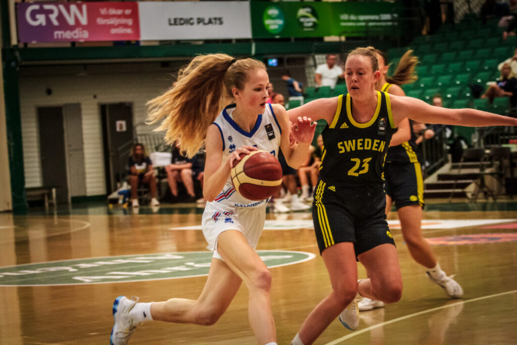 Í upphafi seinni hálfleiksins ná heimastúlkur að koma í veg fyrir að Ísland komist lengra á undan. Íslenska liðið á mjög erfitt með að skora í þriðja leikhlutanum og nær Svíþjóð að vinna muninn í fjórðungnum, en staðan er jöfn fyrir lokaleikhlutann, 43-43. Leikurinn helst svo nokkuð jafn vel inn í fjórða leikhlutann þar sem Svíþjóð er 2 stigum á undan þegar fimm eru til leiksloka, 55-57. Á lokamínútunum fær íslenska liðið nokkur skot til að detta fyrir sig og halda heimastúlkum að mestu aftur á varnarhelmingi vallarins. Uppskera að lokum flottan fyrsta sigur á mótinu, 70-66.