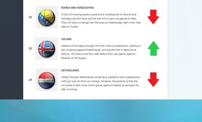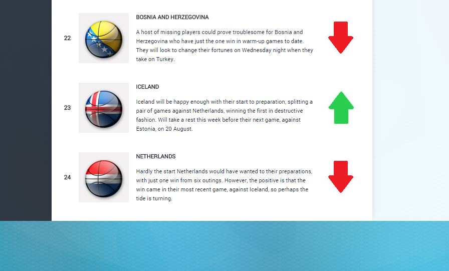 FIBA Europe hafa nú gefið út í annað skiptið styrkleikastiga fyrir þau lið sem eru á lokakeppni Eurobasket 2015. Í síðustu viku voru Íslendingar í síðasta sæti einfaldlega af því að liðið hafði ekki leikið neina leiki á undirbúningstímabilinu. Tveir leikir gegn Hollendingum í síðustu viku hafa hinsvegar gert það að verkum að liðið klifraði upp fyrir þá Hollendinga sem hafa nú tapað 6 af síðust 7 leikjum sínum.