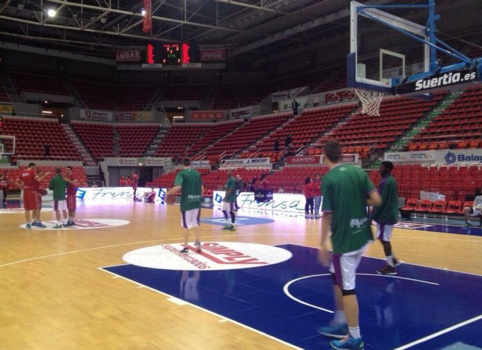 Mynd:Unicajabaloncesto Á myndinni má sjá Jón Arnór spjalla við gömlu félaga sína í Zaragoza ef rýnt er til miðju vallarins.