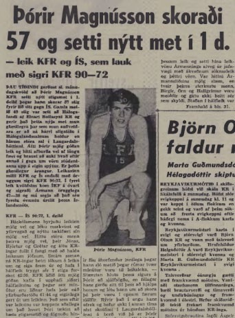"Gamla metið 49 stig var sett að Hálogalandi af Einar Bollasyni KR og gerir það þetta met mun glæsilegra þar sem mun auðveldara er að ná hárri stigatölu í Hálogalandssalnum heldur en í hinum stóra sal Laugardalshöllinni. Átti Þórir mjög góðan leik og hitti afburða vel af löngu færi og brauzt að auki hvað eftir annað í gegn um vörn stúdentanna uppá eigin spýtur"