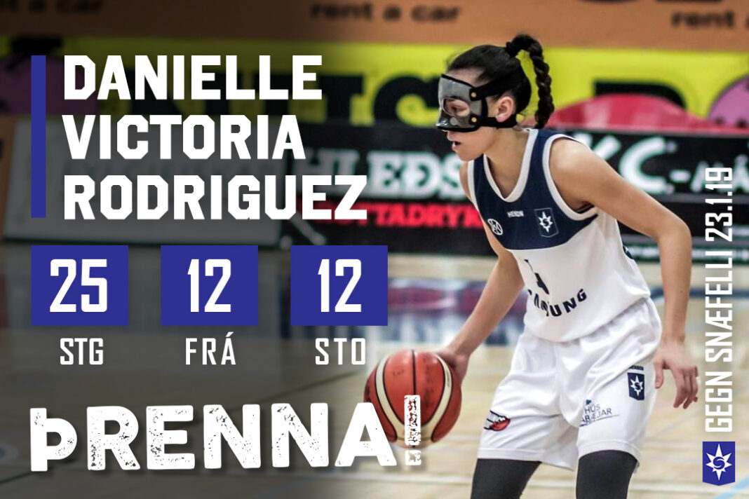 Danielle Victoria Rodriguez er óstöðvandi þessa daganna og setti þrennu annan leikinn í röð, og sá þriðju í fjórum leikjum, í kvöld þegar Stjarnan lagði Snæfell með einu stigi eftir framlenginu í algjörum naglbít.