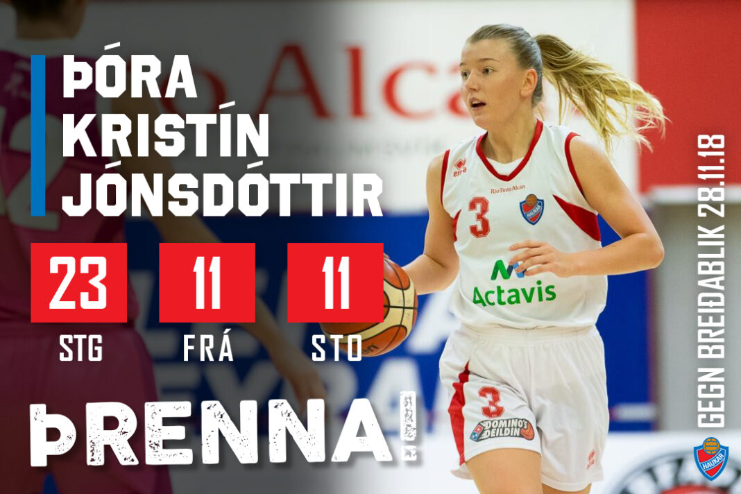 Þóra Kristín Jónsdóttir náði sinni fyrstu þreföldu tvennu á ferlinum í kvöld er hún skoraði 23 stig, náði 11 fráköstum og gaf 11 stoðsendingar í sigri Hauka gegn Breiðablik.