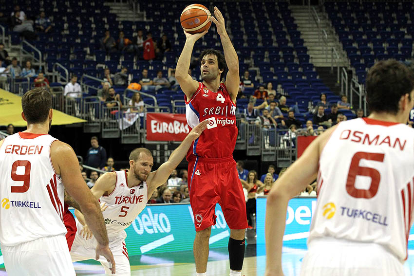Serbar voru rétt í þessu að vinna öflugan 91-72 sigur á Tyrkjum á EuroBasket í Berlín. Töframaðurinn Milos Teodosic leikmaður CSKA Moskvu í Rússlandi gerði 17 stig í leiknum og stýrði sýningunni með 13 stoðsendingar í þokkabót. Serbar hafa nú unnið alla fjóra leiki sína og á kristaltæru að þeir eru á leið til Frakkland.