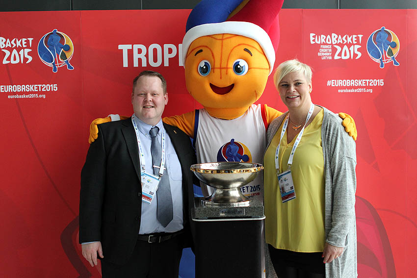 Mynd/ Frá Smáþjóðaleikunum 2015 í Laugardal, Hannes ásamt Guðbjörgu Norðfjörð varaformanni KKÍ. Frenkie the Fireball í túlkun Márusar Björgvins Gunnarssonar lét sig ekki vanta á myndina.