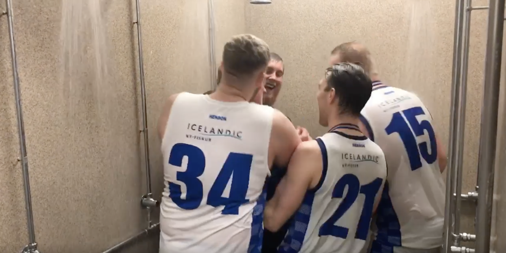 Hér fyrir neðan má sjá fögnuð Reynismanna í klefanum eftir leik, þar sem þjálfara þeirra Jóni Guðbrandssyni er meðal annars hent í sturtuna.