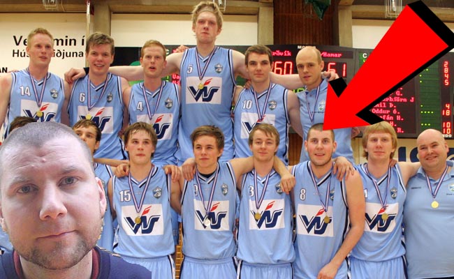 Þarna gefur einnig að líta Ragnar Natahanelsson, Baldur Þór Ragnarsson, Ara Gylfason og á bak við myndina af Peter Öqvist er Oddur Ólafsson. Þetta 2010 lið Hamars/Þórs var skipað eintómum snillingum. Hvernig það æxlaðist að við vorum að brigsla við þessa gömlu mynd er önnur saga en okkur rak í rogastans þegar við allt í einu og skyndilega sáum landsliðsþjálfara Íslands nr. 8 á myndinni!