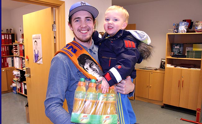 Einhverjir ættu nú að kannast við pabbann á myndinni en sá heitir Rúnar Ingi Erlingsson leikmaður Vals í 1. deild karla. Þeir feðgar voru kampakátir með sigurlaunin, Óliver með Gatorade-drykkina og Rúnar með trefilinn sem hann var ekki lengi að sveipa um hálsinn á sér enda Hörður uppáhalds leikmaðurinn hans í þýska boltanum.