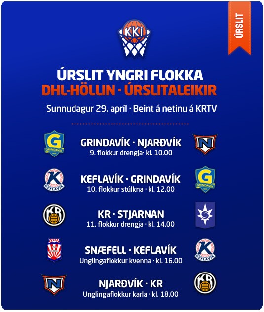 Í dag lýkur Íslandsmótinu hjá yngri flokkunum með fimm spennandi úrslitaleikjum sem fram fara í DHL-Höllinni í Reykjavík. Nú kl. 10:00 hefst úrslitaviðureign Grindavíkur og Njarðvíkur í 9. flokki drengja en deginum lýkur svo með slag Njarðvíkinga og KR í unglingaflokki karla kl. 18:00. Leikirnir verða í beinni netútsendingu hjá KR TV.
