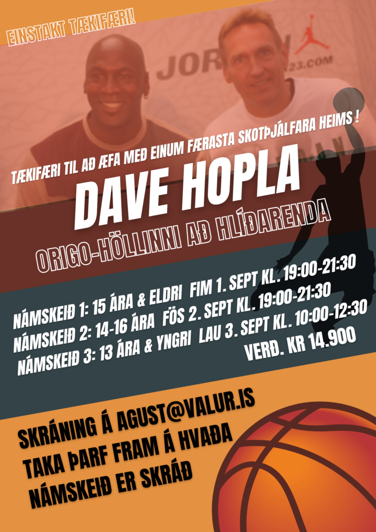 Boðið uppá tækifæri að æfa með Dave Hopla á sérstöku námskeiði í næstu viku. Námskeiðið er hugsað fyrir stelpur og stráka á aldrinum 11 ára og eldri. Einungis sextán einstaklingar komast að í hvert námskeið og seldist upp síðast þegar upp á aðeins nokkrum klukkutímum. Reynslu miklir þjálfara á borð við Ágúst Björgvinsson og Finnur Freyr Stefánsson munu einnig þjálfa á námskeiðinu.